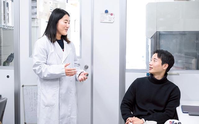 研究室の先輩と。上級生が手がけている先行研究の話を聞くのは大切な勉強の一環です。他にも海外留学事情について、実験用マウスの扱い方など、話題は尽きません。
